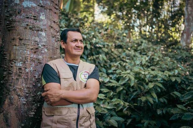 Luis Villegas es un caficultor que ha integrado la preservación de árboles en su finca y que produce abono orgánico para reducir su huella de carbono. (Foto: Rikolto)