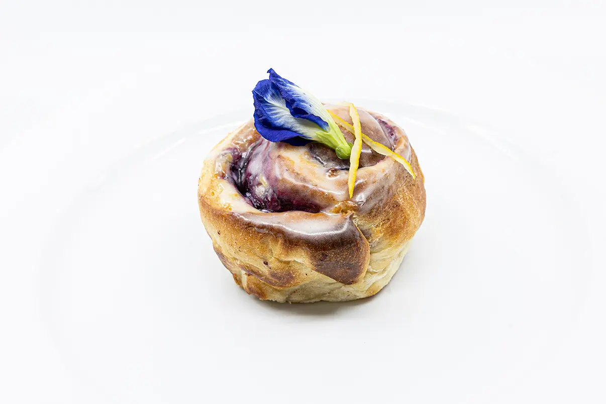 Con un primoroso roll de arándanos y lima, Adriana Marotta conquistó el tercer lugar del concurso. El relleno era de arándanos y el glaseado de lima. Lo decoró con flores comestibles.